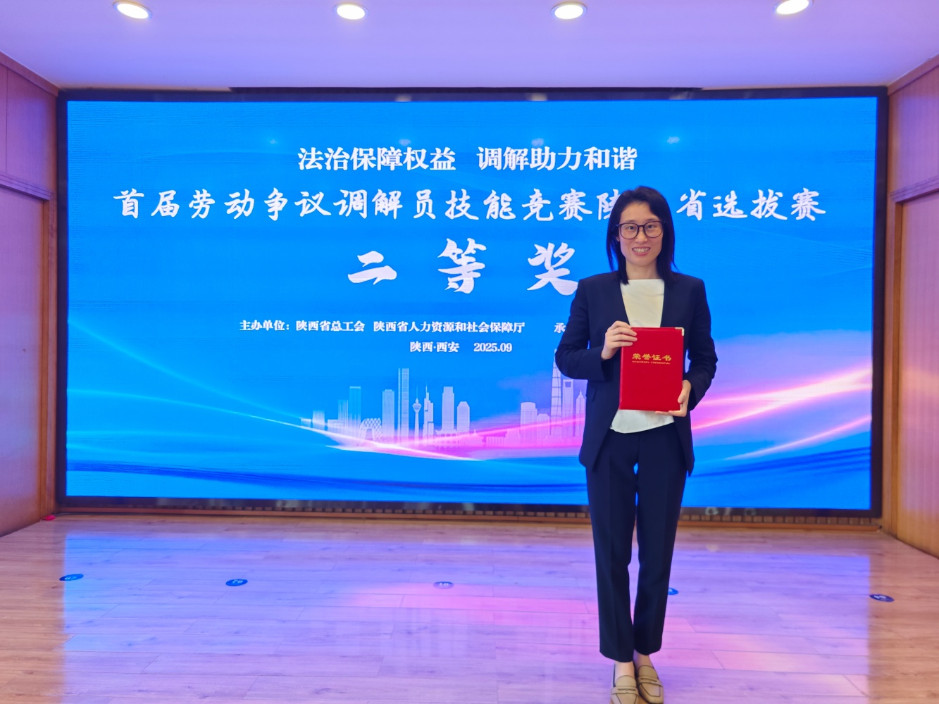 9月29日,首届劳动争议调解员技能竞赛陕西选拔赛在陕西西安成功举办。北京德恒(西安高新区)律师事务所王静律师在竞赛中荣获二等奖,成功入选首届劳动争议调解员陕西省集训队。省农林水利气象工会荣获优秀组织奖。
